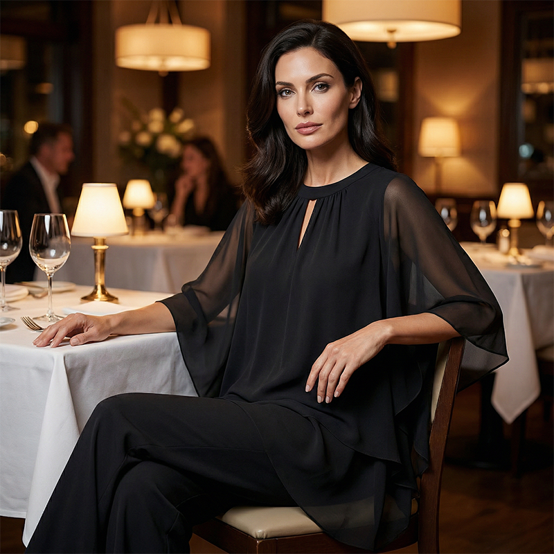 ELEGANT TWO-PIECE DESIGN - Combines a flowy, layered top with matching wide-leg pants. This coordinated set offers a sophisticated, put-together look with minimal effort, making it perfect for any event where you want to impress.