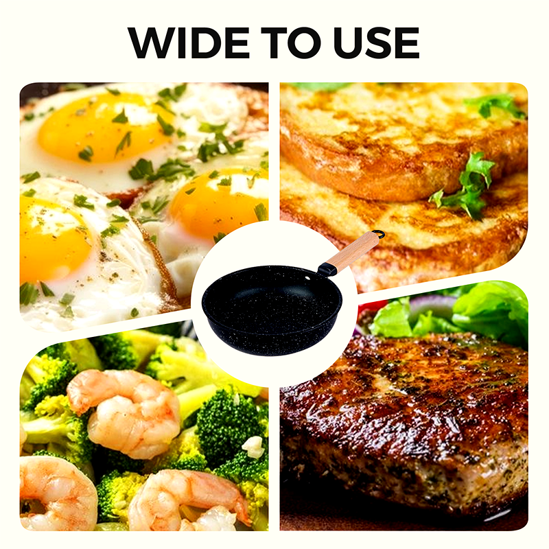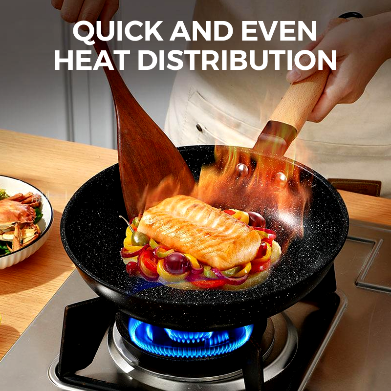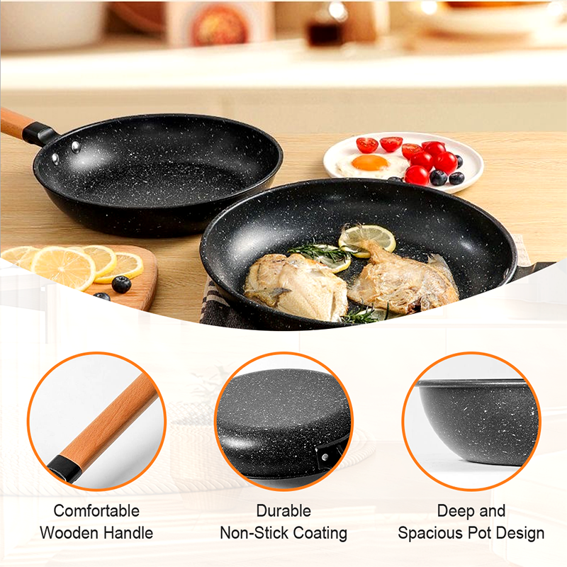DESIGN DE POT PROFUND ȘI SPAȚIOS: Dispune de un design structural mai mare și mai adânc pentru a preveni în mod eficient scurgerile în timpul prăjirii sau amestecării. Poate găzdui o cantitate mare de ingrediente, făcând gătitul mai convenabil și mai eficient.