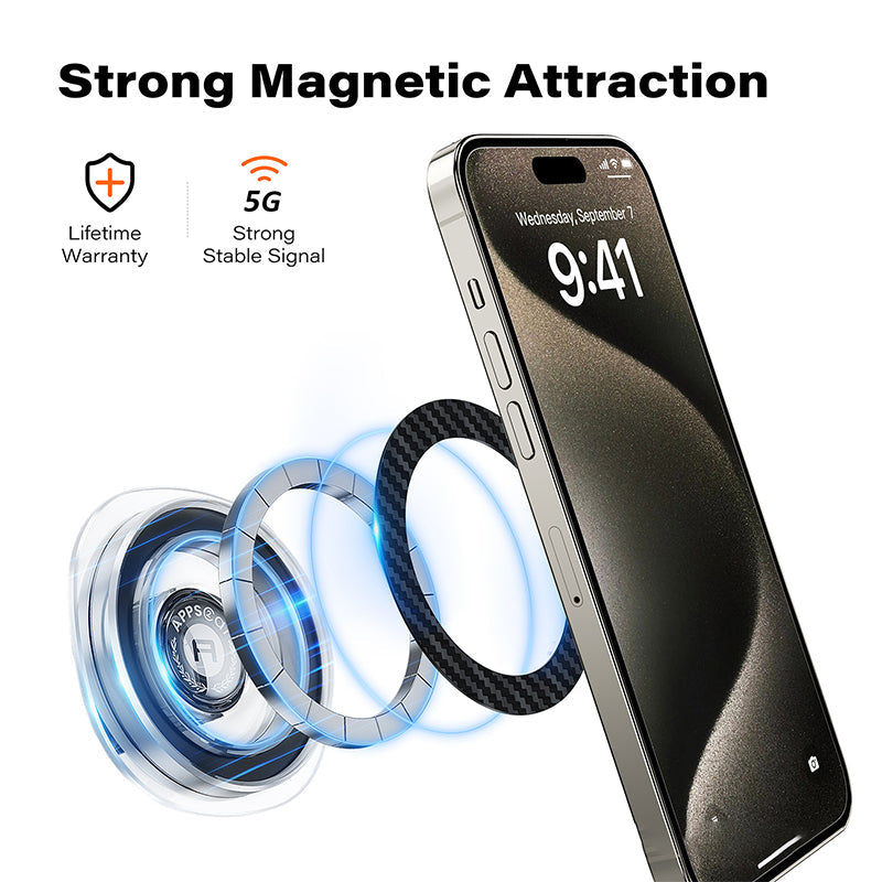 Acesta este un accesoriu magnetic MagSafe pentru toate seriile iPhone. Accesoriul nu are un inel metalic și este potrivit pentru telefoanele mobile cu o carcasă obișnuită. Are un atașament magnetic puternic care asigură o conexiune stabilă între telefon și accesoriu. În plus, accesoriul suportă rețelele 5G pentru a asigura o transmisie stabilă a semnalului.