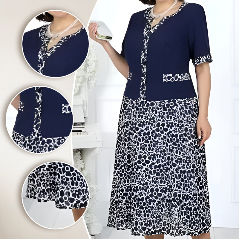 Îmbrăcată într-un albastru marin intens, această rochie este împodobită cu flori pe mâneci, buzunare și decolteu, care se potrivesc cu modelul de pe tiv pentru o notă suplimentară de eleganță.