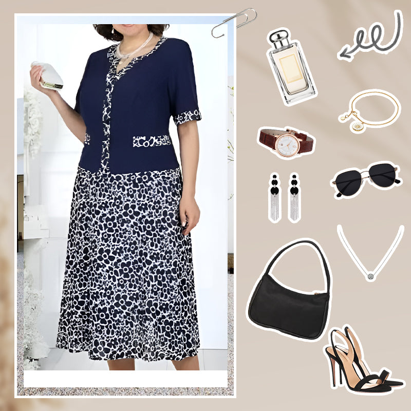 Această rochie elegantă este ca un costum din două piese, combinând o rochie florală cu un top mulat în stil cardigan pentru confort și frumusețe.